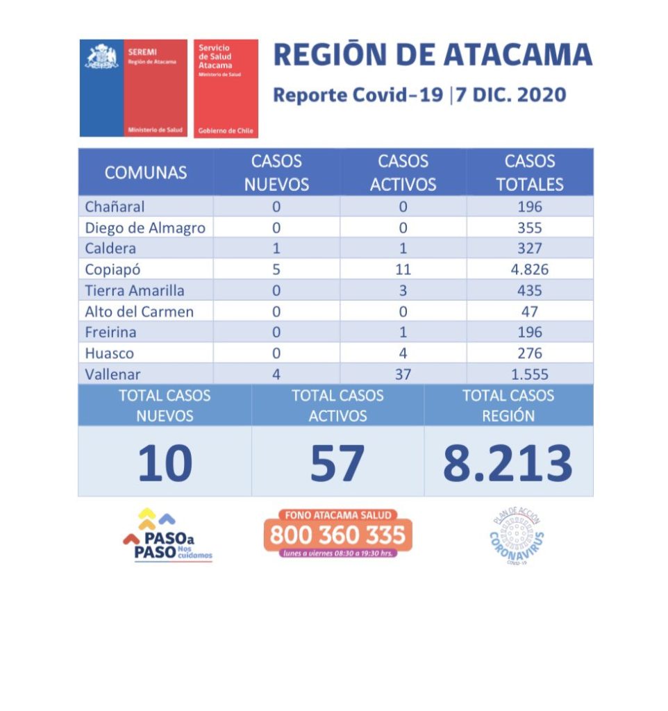 La autoridad sanitaria informó este lunes 10 casos nuevos positivos de COVID-19 en la región de Atacama, de los cuales seis fueron casos sintomáticos y cuatro sin síntomas, además se entregó un reporte de 57 casos activos a nivel regional.