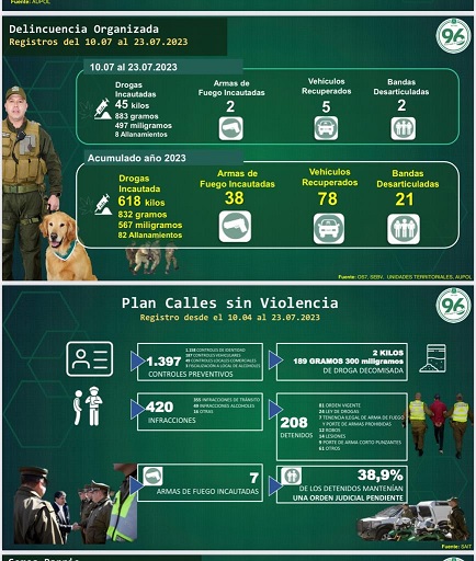 Entre el 10 de abril y 23 de julio, Carabineros ha logrado la detención de 208 infractores de ley, de los cuales el 38,9% mantenía orden de aprehensión vigente; es decir 81 detenidos. Del mismo modo, en el plan Calles Sin Violencia se ha detenido a 24 personas por ley de drogas, otras 7 por tenencia ilegal de armas de fuego y porte de armas prohibidas, 12 por el delito de robo, 14 por lesiones, 9 por porte de arma punzante y 61 por otros delitos.