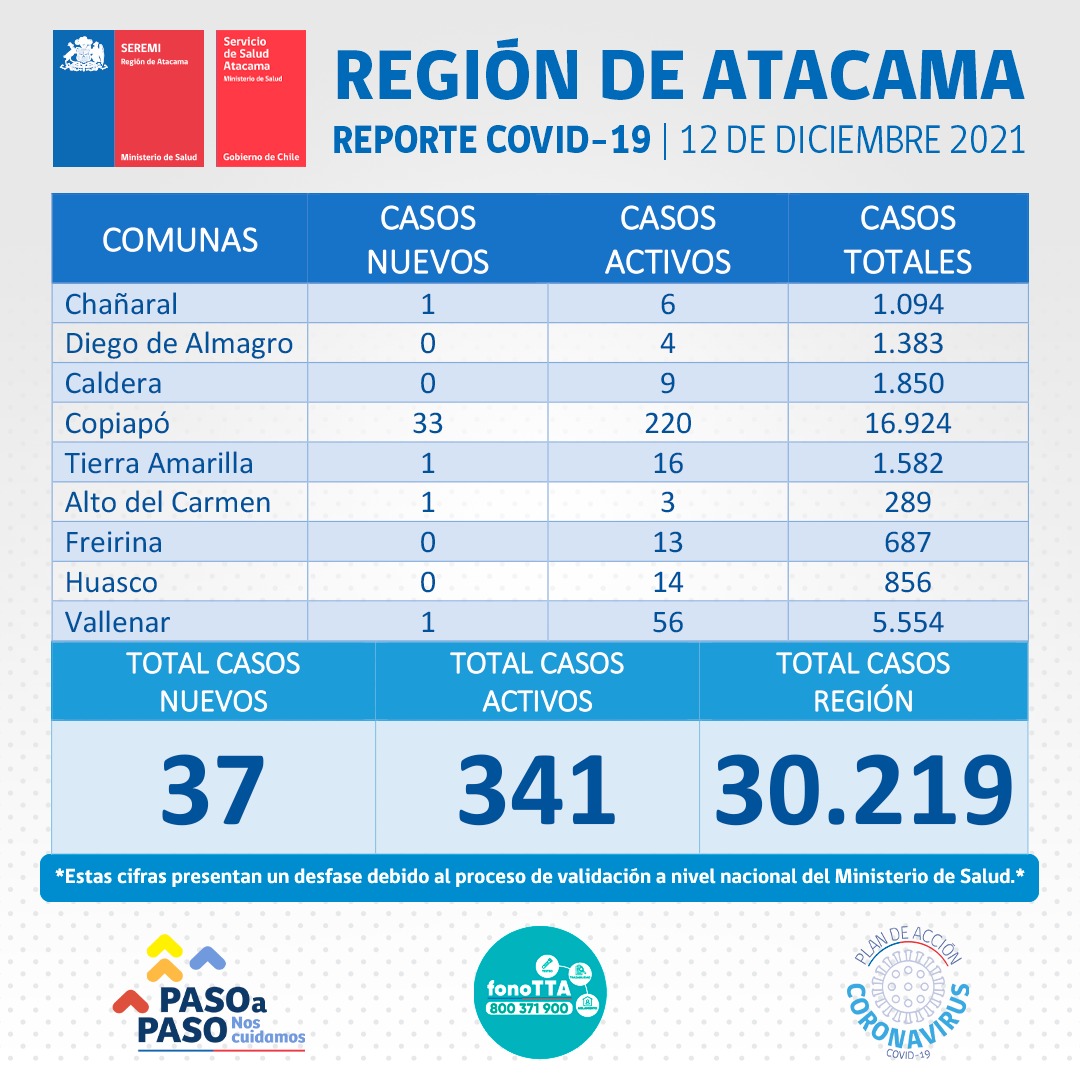 El nuevo reporte entregado por el Minsal señala que ayer domingo 12 de diciembre se registraron 37 nuevos casos positivos de Coronavirus en la región de Atacama.