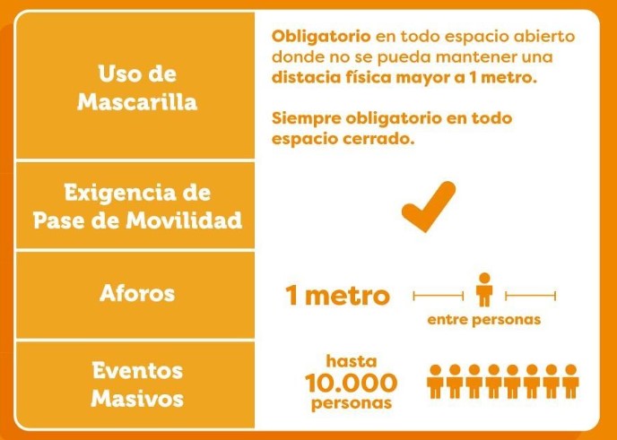 Entre las condiciones de la fase incluyen el uso obligatorio de la mascarilla en espacios cerrados, la exigencia del pase de movilidad, y un aforo de hasta 10 mil personas en eventos masivos.