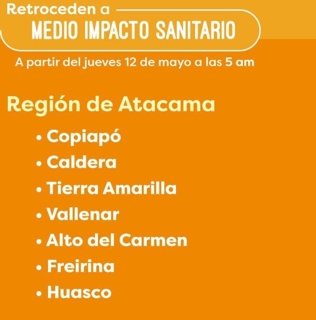 ¡Atención región de Atacama! Desde el jueves 12 de mayo a las 5.00 am, las comunas de Copiapó, Caldera, Tierra Amarilla, Vallenar, Alto del Carmen, Freirina y Huasco país retroceden a Medio Impacto Sanitario, lo que tiene un efecto en los aforos.