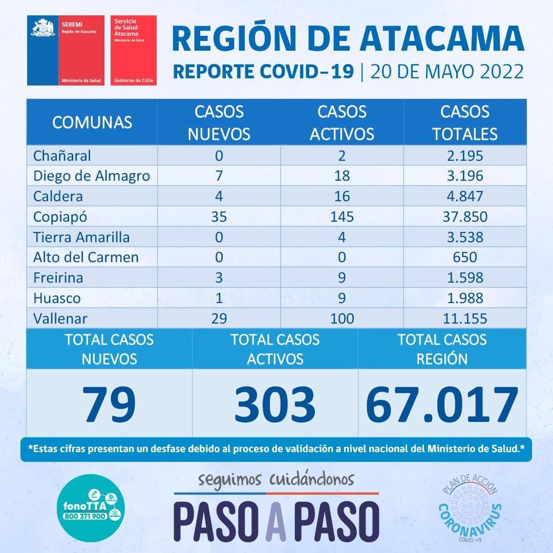 Este viernes el Minsal confirmó 79 casos nuevos de la pandemia del Covid-19 en Atacama, tercer día consecutivo de alzas en los contagios, de ellos 33 fueron sintomáticos, 27 sin síntomas, 19 casos reportados por laboratorio y 45 por antígeno. Los activos volvieron a subir, llegando a 303 casos en las últimas 24 horas a nivel regional, con una tasa de incidencia de 95,3 uno de los más altos indicadores a nivel nacional.