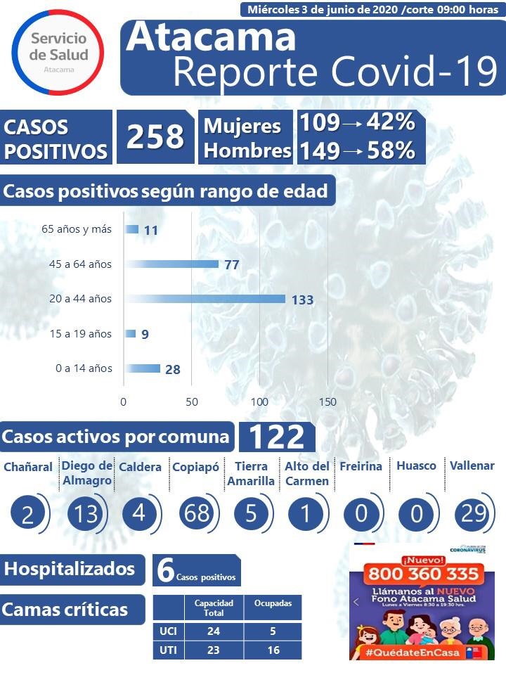 El Secretario Regional Ministerial (Seremi) de Salud, Bastián Hermosilla, informó que, si bien la cifra de contagiados llegó a 258, 53 % (136) logró recuperarse, lo que da un total de 122 casos activos, de los cuales seis siguen hospitalizados y demás cumplen sus confinamientos tantos en sus domicilios como en las Residencias Sanitarias.