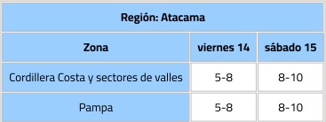 La Dirección Meteorológica de Chile entregó el reporte de hoy miércoles 12 de enero, donde se pronostica para la noche del viernes hasta la noche del sábado 15 de enero precipitaciones de moderadas a fuerte en corto periodo de tiempo, para la Zona de la Cordillera de la Costa, sectores de valles y Pampa.