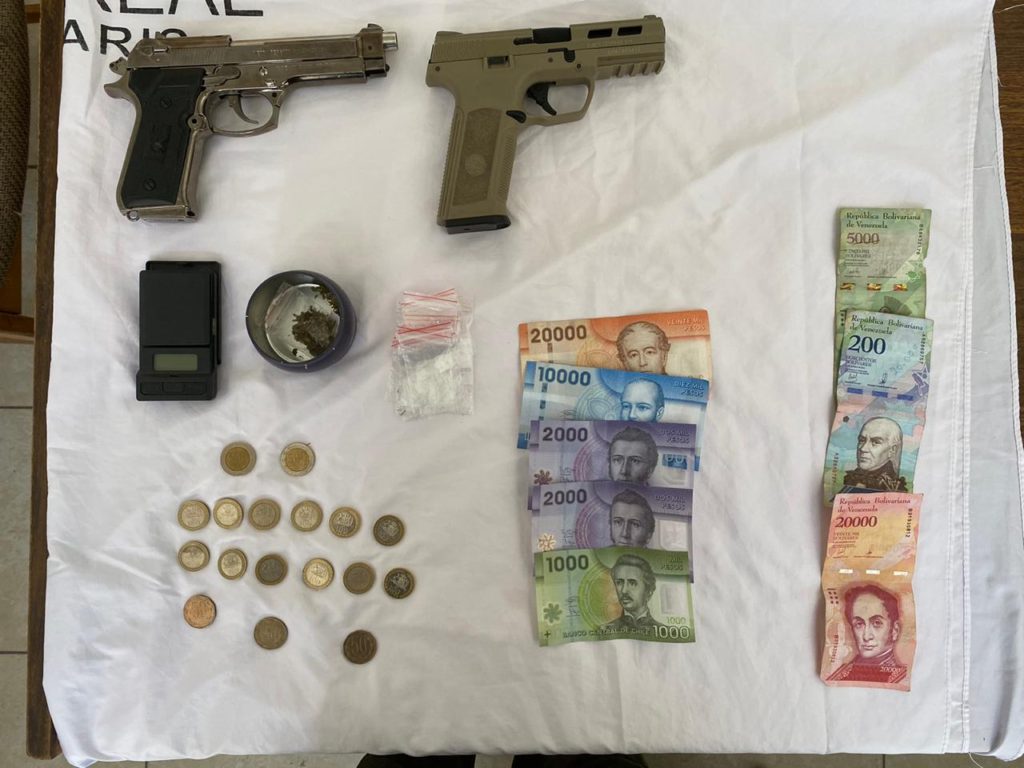 Al proceder a la revisión de las especies que portaba el adolescente, el personal policial pudo comprobar que en un bolso había una pistola de aire comprimido color café, un encendedor de tamaño y apariencia similar a una pistola, de color plata, una pesa digital y varias dosis de cannabis sativa. Además de dinero en efectivo y bolsas pequeñas para dosificación de droga.