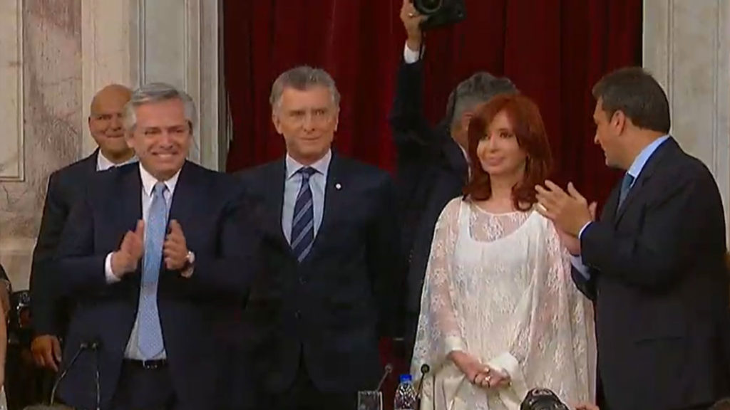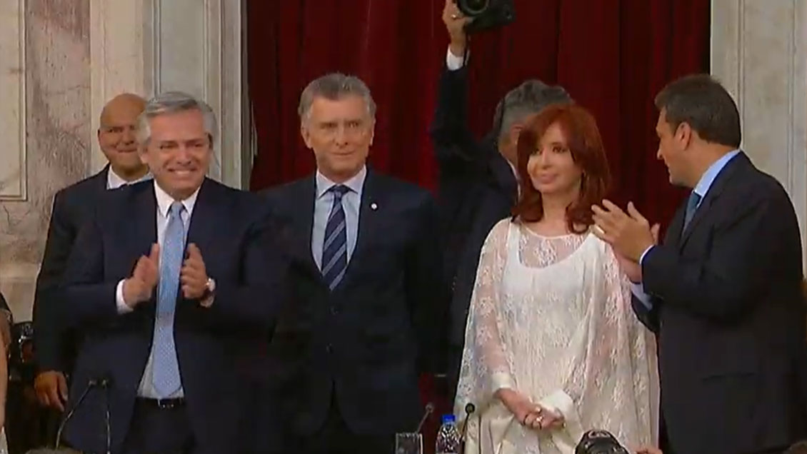 En la sesión de la Asamblea Legislativa -órgano parlamentario que engloba a los senadores y los diputados-, Fernández recibió de su antecesor, Mauricio Macri, la banda y el bastón presidencial y juró el cargo ante la titular saliente del Senado, Gabriela Michetti, antes de que la ex mandataria Cristina Fernández hiciera lo mismo como nueva vicepresidenta del país.