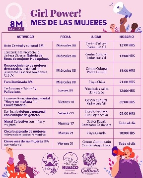 HUASCO: Ya inició marzo, y la @oficinadelamujer_huasco junto a la Corporación Cultural Municipal de Huasco nvitan a todas las mujeres del territorio a participar de este 8M y todas las actividades que habrán durante marzo, el Mes de las Mujeres. La invitación acota: ‘por un país sin violencia, sin discriminación, sin feminicidios, por justicia y derechos para todas nosotras. Súmate a participar de todas las actividades culturales que tenemos preparadas para ti’.