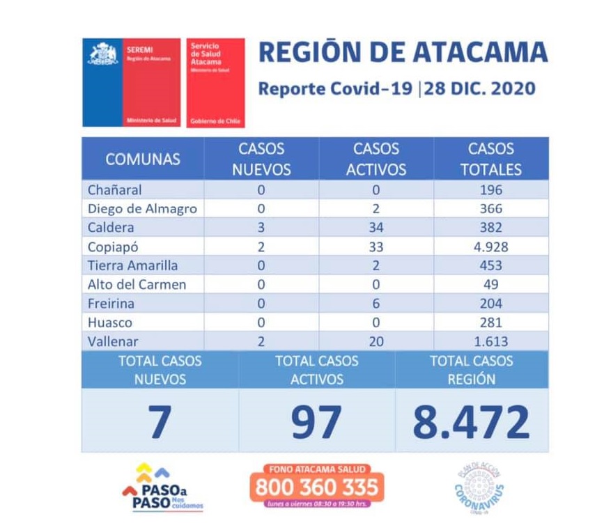 Atacama registra 7 nuevos casos y totaliza a la fecha 8.472 positivos de Coronavirus