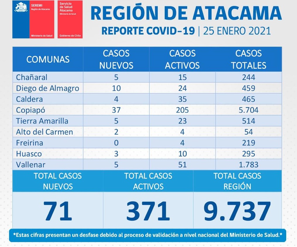 El Ministerio de Salud, entregó un nuevo balance de la pandemia sanitaria del Coronavirus en Atacama, y es así que ayer lunes 25 de enero, se contabilizaban 71 casos nuevos en la región.