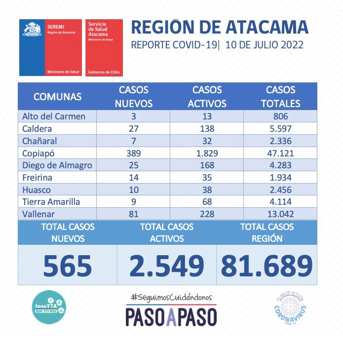 La Autoridad Sanitaria informó que ayer domingo 10 de julio se reportaron nuevos 565 casos positivos de Coronavirus en la región de Atacama.