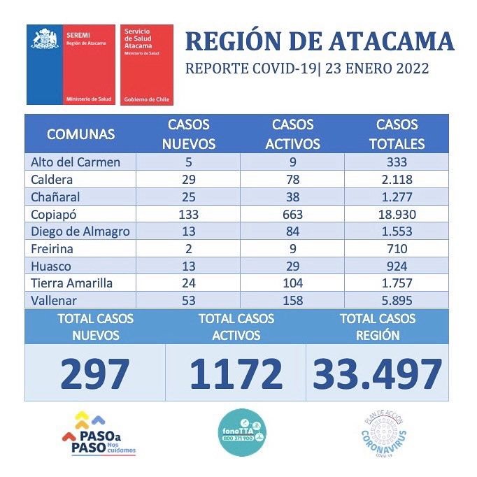 El Ministerio de Salud, entregó el reporte diario, y ayer domingo 23 de enero se reportaron 297 nuevos casos positivos de Coronavirus en la región de Atacama.