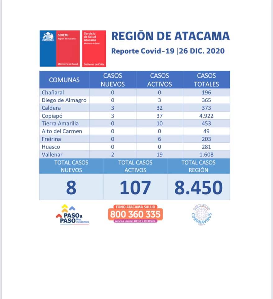 Es así que indica que ayer sábado 26 de diciembre se reportaron 8 casos nuevos positivos de Coronavirus en la región de Atacama.