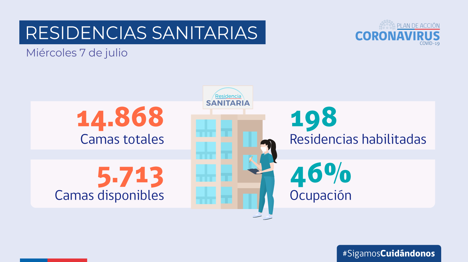 Con respecto a las Residencias Sanitarias, disponemos de 198 recintos de hospedaje, con 14.868 camas totales. La ocupación real a nivel nacional es de un 46%, quedando un total de 6.176 camas disponibles para ser utilizadas.