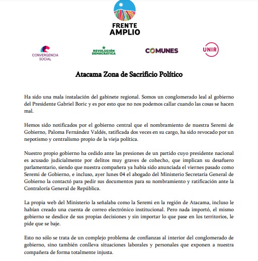 A continuación la declaración completa del Frente Amplio Atacama tras la remoción de Paloma Fernández como Seremi de Gobierno: