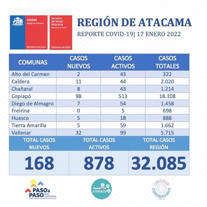 En el día de hoy, se reportan 169 nuevos casos positivos de Coronavirus en la región de Atacama. 98 casos corresponden a la comuna de Copiapó, 32 casos a la comuna de Vallenar, 11 casos en la comuna de Caldera, 8 casos para la comuna de Chañaral, 7 casos en la comuna de Diego de Almagro, 5 casos en Huasco y Tierra Amarilla, y 2 casos para la comuna de Alto del Carmen.