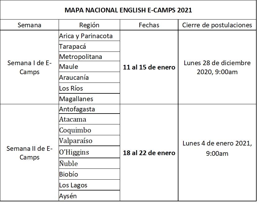 Para conocer más información sobre los requisitos de postulación, bases y contacto para resolver dudas, ingresar aquí: https://ingles.mineduc.cl/2020/12/14/atencion-estudiantes-de-ensenanza-media-ya-esta-abierta-la-postulacion-a-los-english-e-camps-2021/