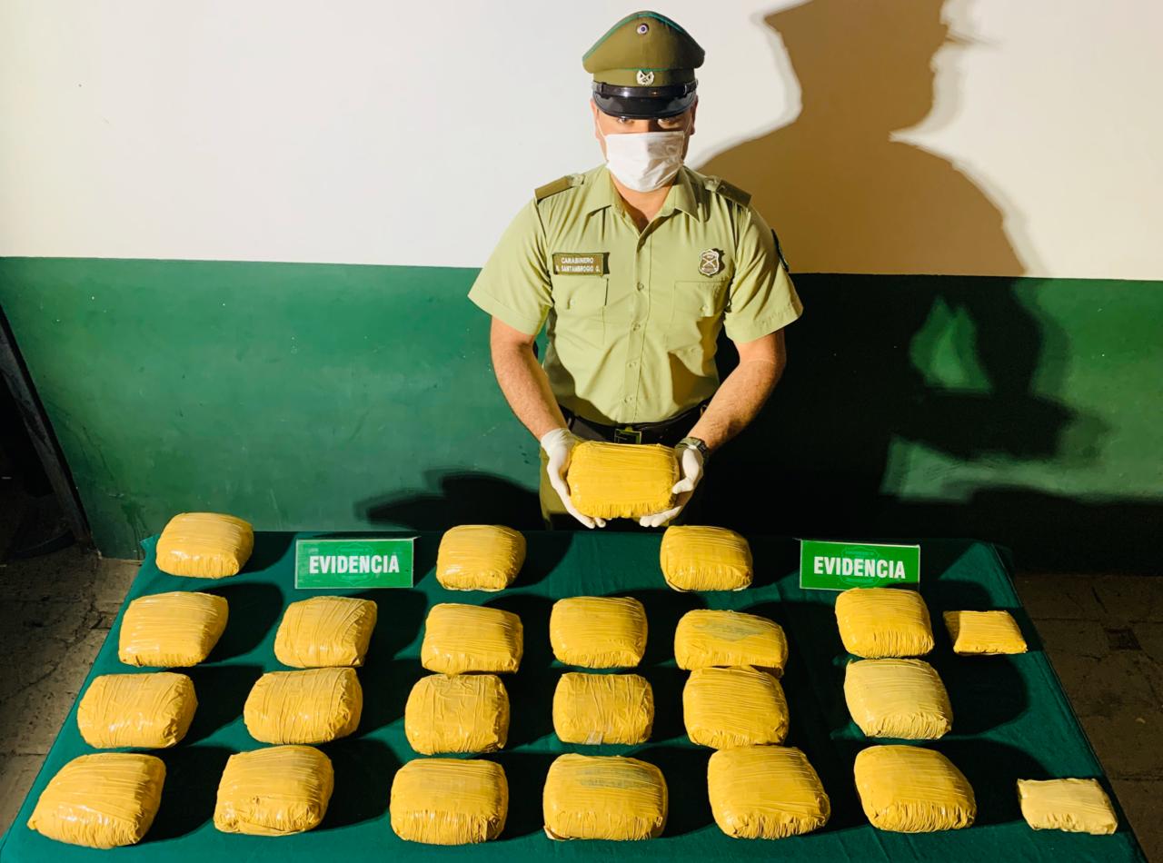 En un nuevo operativo en el marco de los controles preventivos que implementa Carabineros en la Ruta 5 Norte, prosiguiendo con el programa Frontera Segura para impedir el tránsito de droga por la región hacia la zona central, personal del O.S.7 Atacama con la invaluable colaboración del can Darwin logra detectar y luego incautar desde una maleta que iba en el portaequipaje de bus interprovincial Pluss Chile una cantidad significativa de drogas, 23.774 dosis de marihuana prensada; 65 dosis de cocaína y 17 dosis de pasta base de cocaína. Todo con un avalúo comercial en el mercado ilícito de más de $ 24 millones.