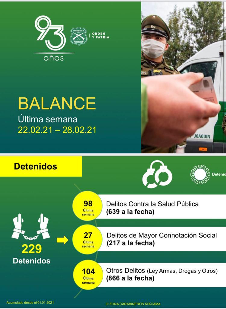 Así se dio a conocer el Jefe de la IIIª Zona de Carabineros Atacama, general Luis Aguilera Mendoza, este miércoles en el balance semanal de la labor policial.