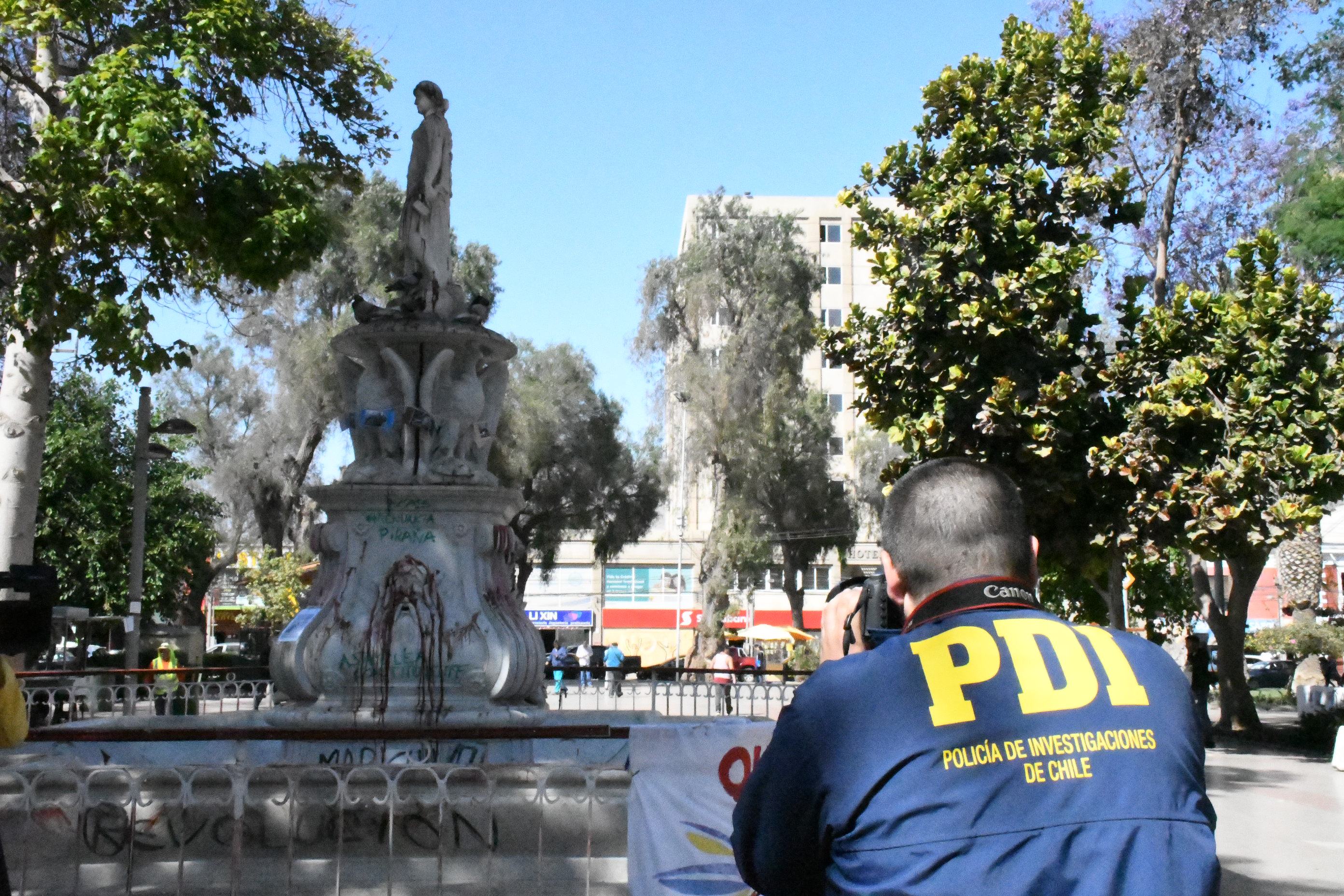 Hasta el corazón de la Plaza de Armas concurrió el personal de PDI Copiapó, para iniciar la labor investigativa tendiente a tratar de ubicar a los causantes de los serios daños que han sufrido los monumentos, especialmente la Estatua a la Minería, situación que causó indignación en gran parte de la comunidad que logró observar las condiciones en que la dejaron los manifestantes descolgados de las manifestaciones.