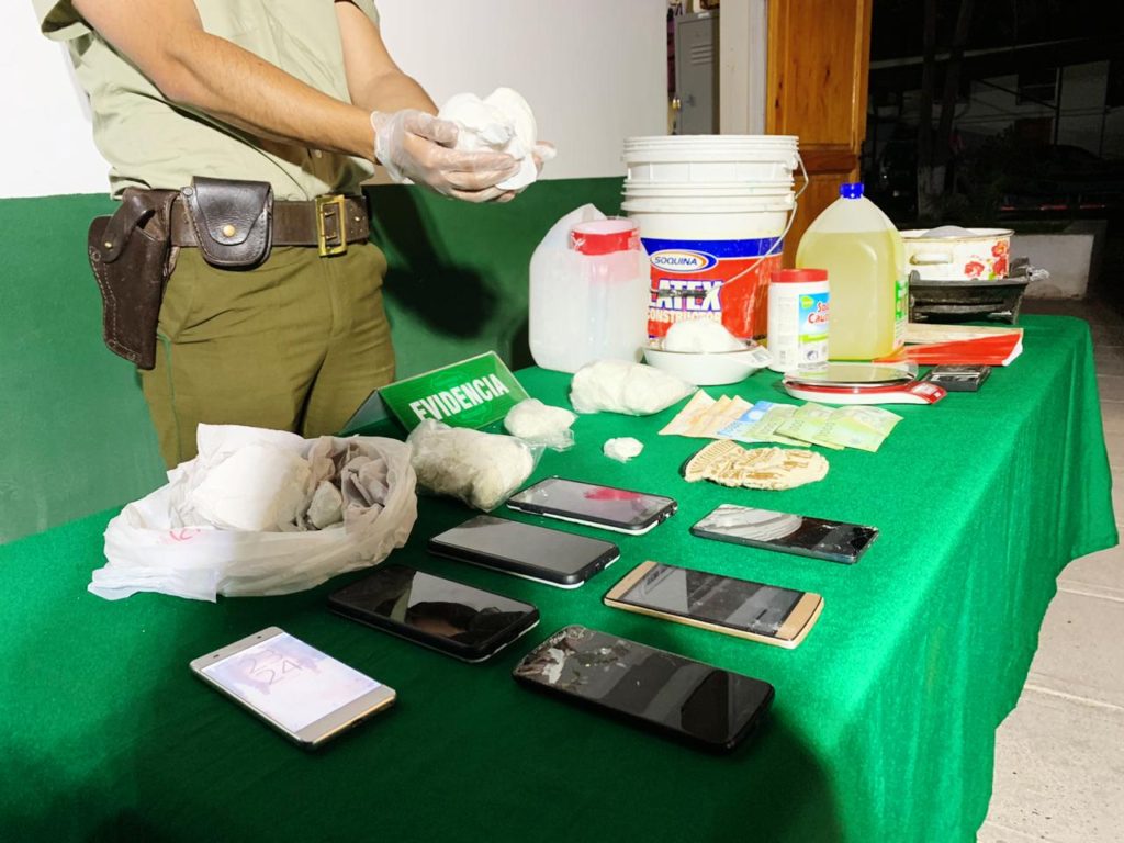 En el sitio también había 76 mil pesos, dos celulares Samsung modelos Galaxy J4 y Galaxy A10 de la compañía Entel, un bidón de cinco litros de ácido muriático, un tarro de soda caustica, una cocina portátil a gas, una balanza digital encendida, así como dos tarros plásticos, un colador de plástico anaranjado y una olla metálica, todos con restos de pasta base de cocaína.