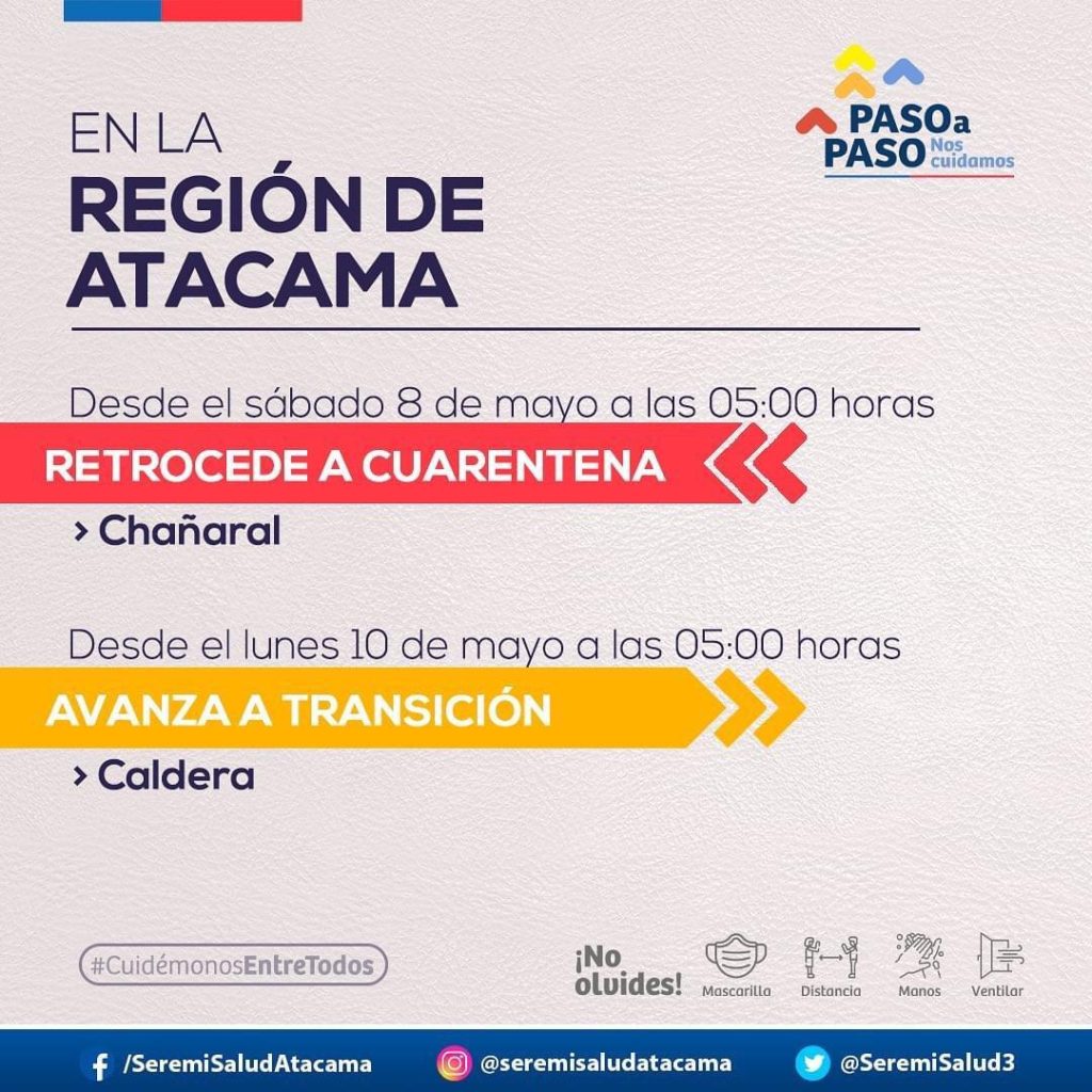 En el caso de Caldera, el avance se hará efectivo desde el lunes 10 de mayo a las 5 horas, mientras que el retroceso de Chañaral al confinamiento, entrará en efecto a partir del sábado 8 de mayo en el mismo horario.