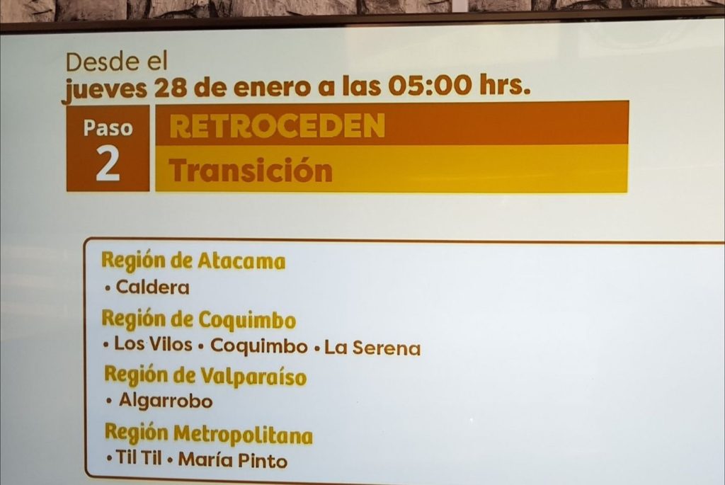 En tanto, pasarán a la etapa de Transición, también desde este jueves 28 de enero a las 05:00 horas las siguientes comunas: Rauco, Parral, Purén, Curarrehue, Teodoro Schmidt, Panguipulli, Caldera, Los Vilos, Coquimbo, La Serena, Tiltil, María Pinto, Algarrobo, Peumo, Quinta de Tilcoco, Requínoa, Olivar, Rancagua y Machalí.