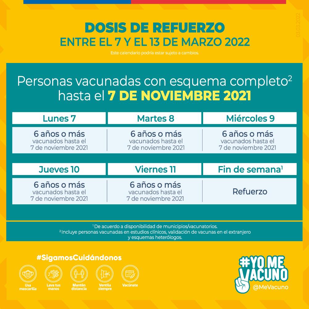 El Ministerio de Salud dio a conocer el calendario de vacunación para la semana del 7 al 13 de marzo. Esta semana comenzarán a recibir la dosis de refuerzo quienes tengan su esquema de vacunación completo hasta el 12 de septiembre de 2021 e inmunocomprometidos hasta el 7 de noviembre, así como también se administrará la cuarta dosis para funcionarios de la salud y personas de 55 años en adelante que hayan recibido su dosis de refuerzo hasta el 7 de noviembre de 2021.