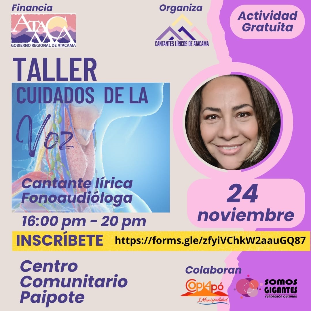 Sobre esto, Verónica Pizarro Cruz, Directora de Gestión y Proyectos de la agrupación destacó que «ésta es una gran oportunidad que nos brinda el Gobierno Regional de Atacama. Nosotros como agrupación, siempre estamos incorporando nuevos integrantes y ellos merecen las oportunidades de poder desarrollar sus talentos. Además, la maestra es de profesión fonoaudióloga y realizará un taller de cuidados de la voz, dirigido a los profesionales de la voz, como cantantes, actores y locutores. Es una gran instancia, completamente gratuita, para conocer cómo podemos cuidar nuestra voz”.