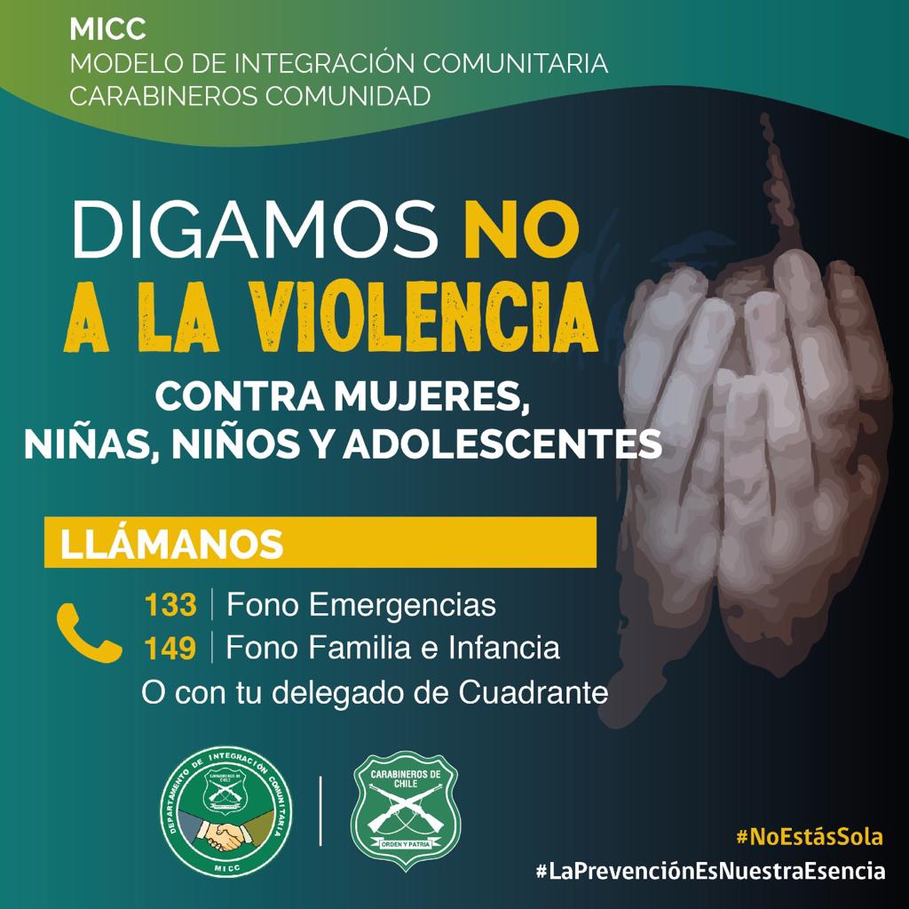 Atrévase y denuncie al 149 Fono Familia, donde será atendido por personal capacitado de Carabineros durante las 24 horas del día, o bien al 133 fono de emergencias policiales, como también al 1455 del Ministerio de la Mujer y Equidad de Género.
