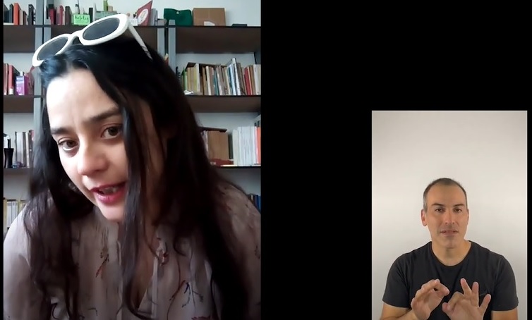 Katerina Trigo, es la intérprete en lengua de señas que traduce los videos de los artistas que participan en la cartelera. Comenzó a trabajar hace años con personas sordas haciendo clases de cocina y desde entonces, no ha parado de seguir formándose y aprendiendo sobre la lengua de señas. “En ese momento no puedo decir que lo aprendí todo, ya que es un continuo aprendizaje de su lengua y su cultura a niveles regional, nacional e internacional. Ahora, con la pandemia por coronavirus, he podido acceder a unos cursos en el extranjero”.