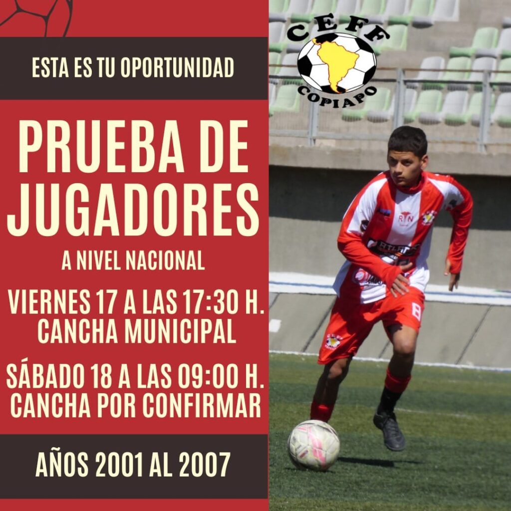 Al respecto, Rodrigo González G., presidente del Club manifestó “quiero invitar a los jóvenes de Copiapó y de la región de Atacama a participar de la prueba de jugadores que vamos a realizar este día viernes, a las 17.30 horas en la Cancha Municipal, a un costado del parque El Pretil. La convocatoria es para jugadores de las categorías 2007 al 2001. Les invito a participar y ser parte del equipo de la Tercera División B de CEFF del año 2024”.