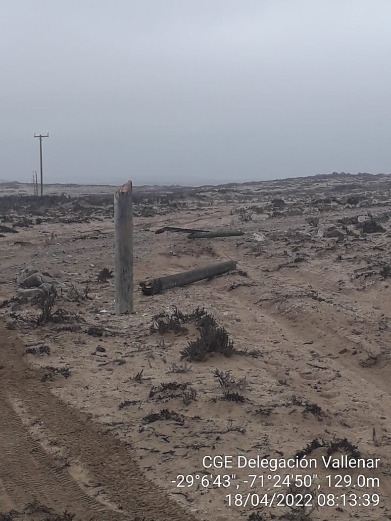 El acto delictual, que afectó el suministro eléctrico para más de 350 clientes del sector rural de Carrizalillo, terminó con la destrucción de 43 postes y toda su infraestructura, y el robo de más de 5 kilómetros de la red de distribución eléctrica que provee energía a esa localidad costera de la provincia del Huasco.