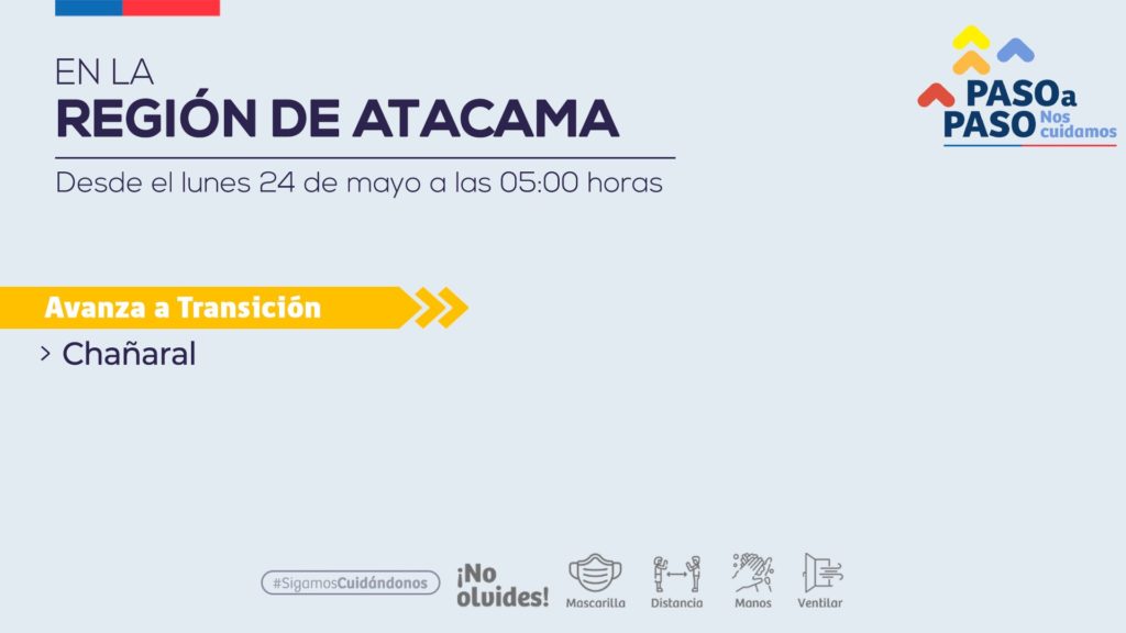 Las autoridades informaron este jueves, durante los anuncios de cambios en el plan “Paso a Paso”, dados durante el reporte COVID, que en la región de Atacama, la comuna de Chañaral saldrá de cuarentena para avanzar a fase 2 de transición.