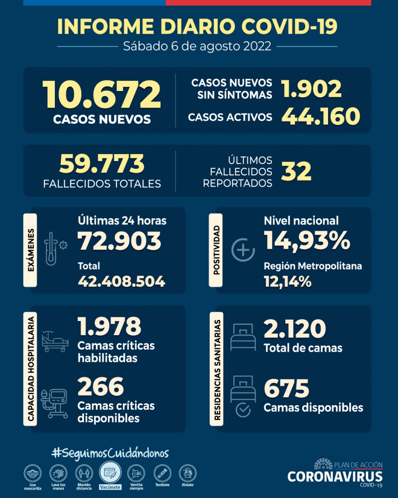 El Ministerio de Salud informa 10.672 casos nuevos de COVID-19, con una positividad de 14,93% en las últimas 24 horas a nivel nacional, con 72.903 exámenes, PCR y test de antígeno. La positividad diaria en la Región Metropolitana es de 12,14%.