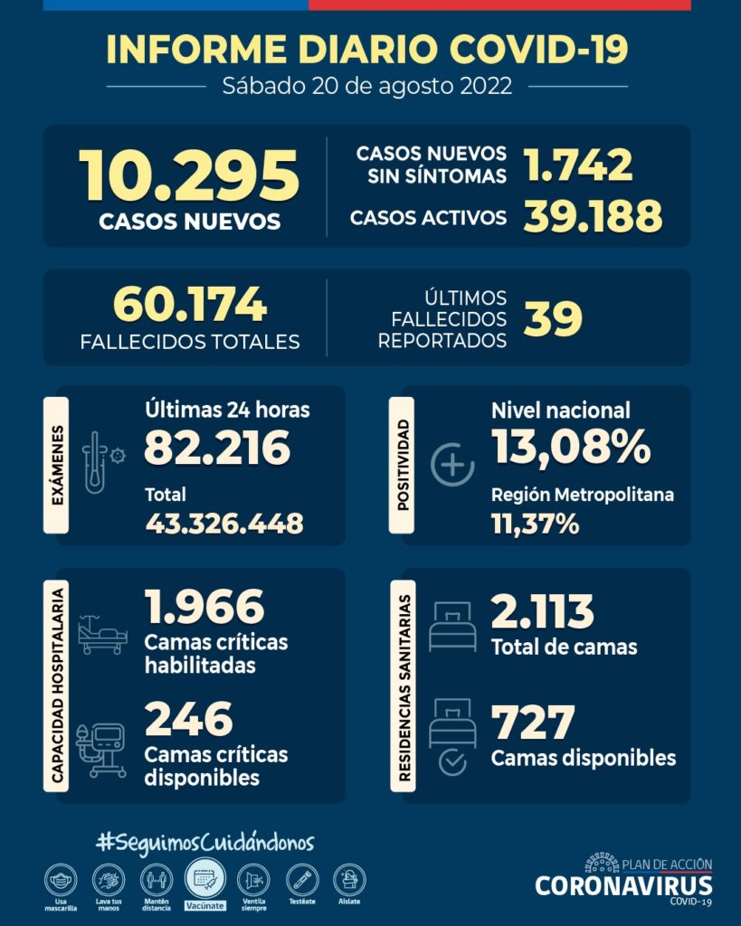 El Ministerio de Salud reportó ayer sábado de10.295 casos nuevos de Covid-19, con una positividad de 13,08% en las últimas 24 horas a nivel nacional, con 82.216 exámenes, PCR y test de antígeno. La positividad diaria en la Región Metropolitana es de 11,37%.