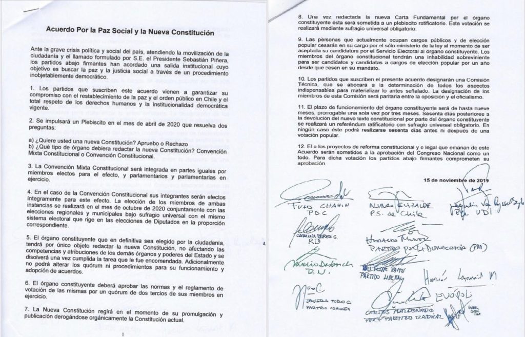 El “Acuerdo por la paz y la nueva Constitución” fue presentado por los partidos de oposición a excepción del Comunista (PC), el Progresista (PP), el Humanista (PH) y el Regionalista Verde (PRV); la oposición, por su parte evaluó la propuesta y, luego de consensuar los principales puntos, anunció que se sumaría a la iniciativa constituyente.