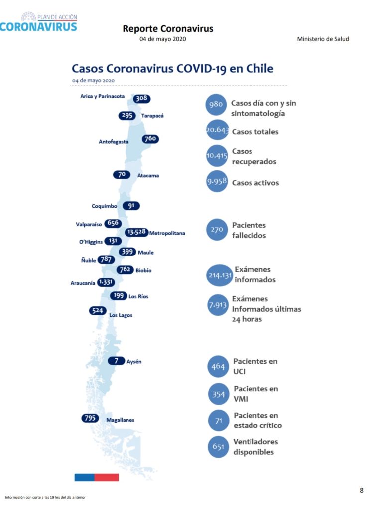 El mayor número de contagiados está en la Región Metropolitana, la cual concentra a 13.528 del total; le sigue Araucanía con 1.331. Las demás no han superado la barrera de los 100 pacientes positivos hasta ahora, de acuerdo con el reporte de coronavirus correspondiente a este lunes, 4 de mayo, publicado por el Ministerio de Salud (Minsal).