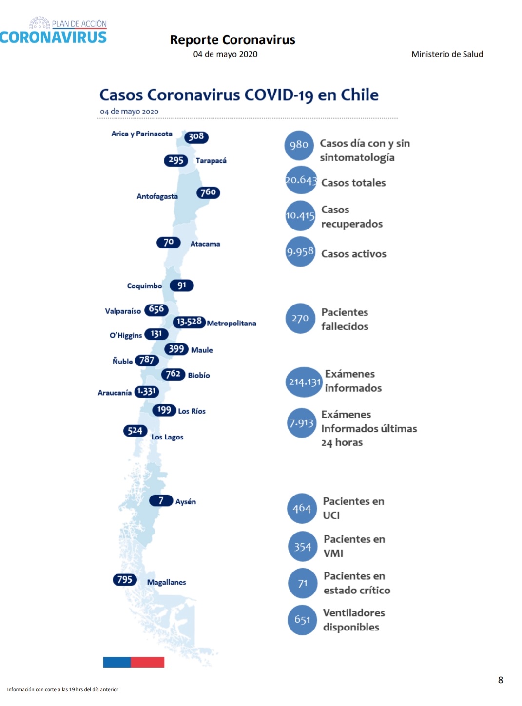 En este caso los decesos ocurrieron ocho de la Región Metropolitana, que hasta ahora llega a 143, uno de la Región de Ñuble que alcanzó los 17 y otro más en la Región del Biobío que registra ocho. Las demás zonas del país también han reportado muertes, a excepción de Atacama, Coquimbo y Aysén.