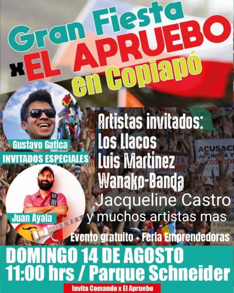 Una Gran Fiesta ciudadana, con mucha música nacional y local, feria de emprendedores, gastronomía local y juegos para niños y niñas, ha organizado el comando por el Apruebo Atacama a desarrollarse a contar de las 11.00 horas del domingo 14 de agosto en el parque Schneider de Copiapó.