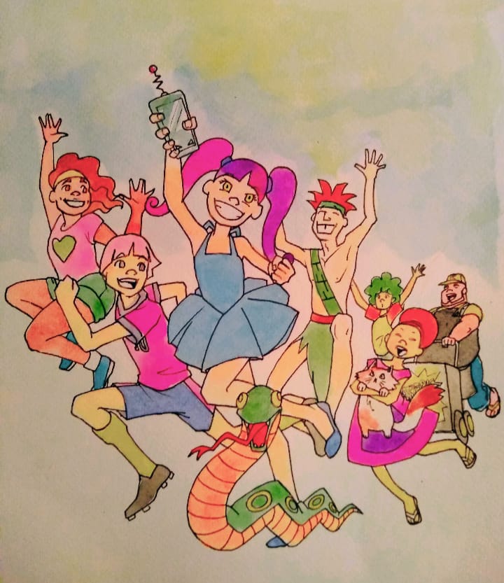 donde usamos las referencias de los 9  protagonistas, que están basados en los bosquejos desarrollados por los propios participantes. Estos dibujos los envié de vuelta para conocimiento también de las niñas y niños. A partir de las interacciones se iban inventando los diálogos para los globos de texto, en esta fase estamos”.
