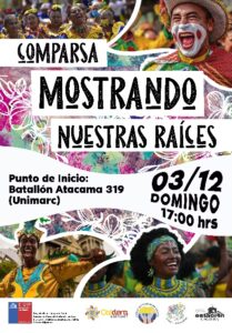 La música y el baile se harán sentir en Caldera gracias a la presentación de la agrupación «Manos Extranjeras Unidas» quienes se presentarán en el evento: «Comparsa: Mostrando Nuestras Raíces». Esta fiesta cultural se realizará el día domingo 3 de diciembre con un recorrido por las calles Avenida Batallón de Atacama, Calle Vicuña, Avenida Diego de Almeyda, Plaza Carlos Condell y finalizará desde calle Matías Cousiño hasta el Centro Cultural Estación, donde se ofrecerá a la comunidad una performance con los ritmos, trajes y música representativa de Colombia.
