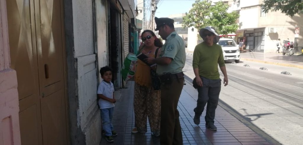 Con este propósito, el personal de la oficina de integración comunitaria, a cargo del suboficial Marcelo Vivanco Huenolaf, está difundiendo acciones de prevención y autocuidado en el sector del casco histórico, incentivando a los transeúntes y comerciantes a prevenir delitos y en caso de ser víctimas llamar de inmediato al 133 fono de emergencias policiales o bien al fono del cuadrante N°1 976683086.