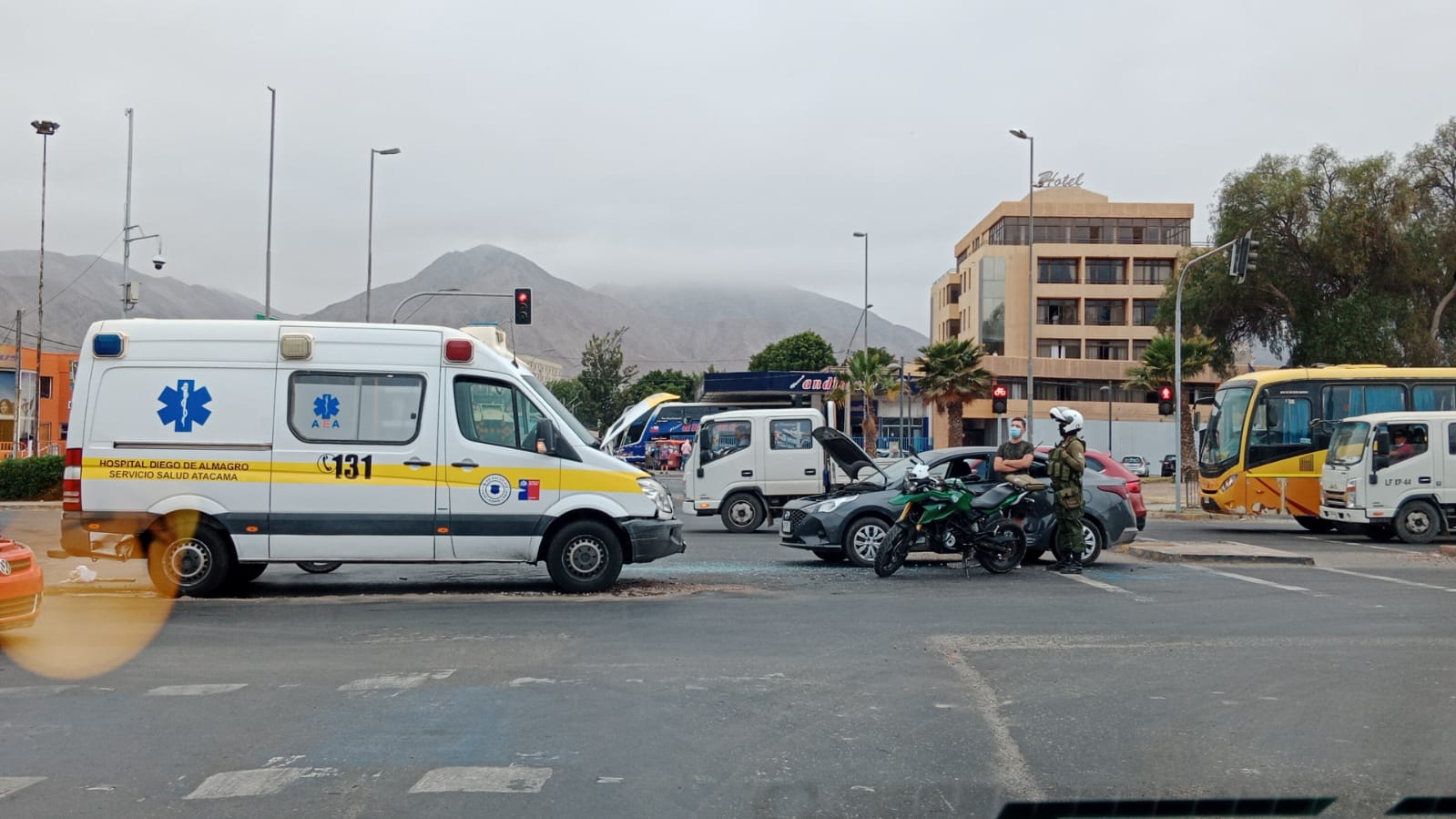 Además una ambulancia del Hospital de Diego de Almagro protagonizó una colisión con un automóvil en la intersección de avenida Copayapu y calle Colipí, en la capital regional. En el hecho se vieron involucradas cinco personas, 3 de las cuales resultaron lesionadas. Concurrió al lugar el ABC de la emergencia.