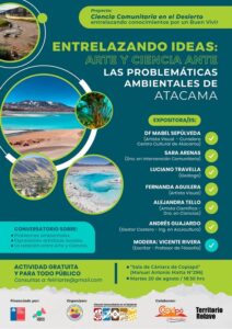 “Entrelazando Ideas: Arte y Ciencia ante las Problemáticas Ambientales de Atacama” es el nombre del conversatorio gratuito y ciudadano que se realizará este martes 20 de agosto, desde las 18:30 horas en la Sala de Cámara de Copiapó. Oportunidad que contará con un panel de conversación de expertas y expertos, de áreas científicas y artísticas, compuesto por: Mabel Sepúlveda, Artista Visual y Curadora del Centro Cultural Atacama; Sara Arena, Dra en Intervención Comunitaria; Luciano Travela, Geólogo; Fernanda Aguilera, Artista Visual; Alejandra Tello, Artista Científica y Dra en Ciencias, Andrés Guajardo, Gestor Costero, Ingeniero en Acuicultura y moderado por Vicente Rivera, Escritor y Profesor de Filosofía.