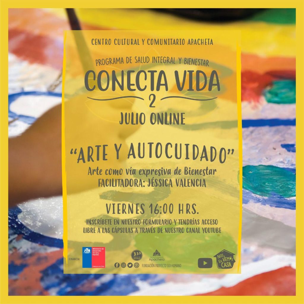 El Centro Comunitario Apacheta de Paipote, está convocando a participar en el taller denominado «Arte y Autocuidado» una vía expresiva para el bienestar, modalidad on line; del Programa de Salud Integral y Bienestar Conecta Vida 2, Chile Compromiso de Todos-2019, del Ministerio de Desarrollo Social y Familia.