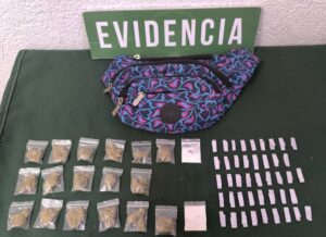 Posteriormente, mediante el análisis de cámaras, se identificó y detuvo al segundo participante del delito de robo con violencia de vehículo motorizado, quien en un bolso que portaba llevaba marihuana, pasta base de cocaína y clorhidrato de cocaína.