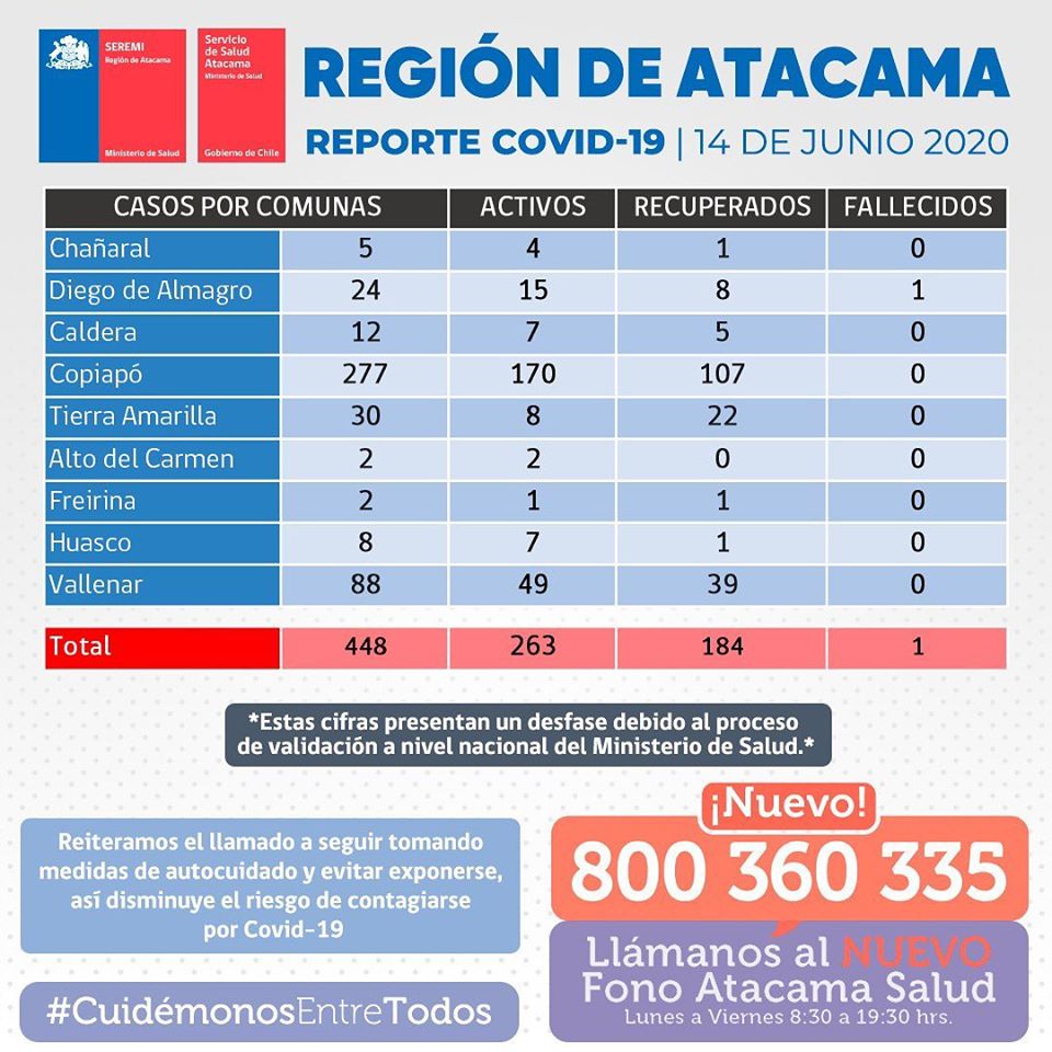 Recalca que con esta confirmación, la Región de Atacama actualmente registra 448 casos positivos de Coronavirus, 184 pacientes recuperados y 1 persona fallecida.