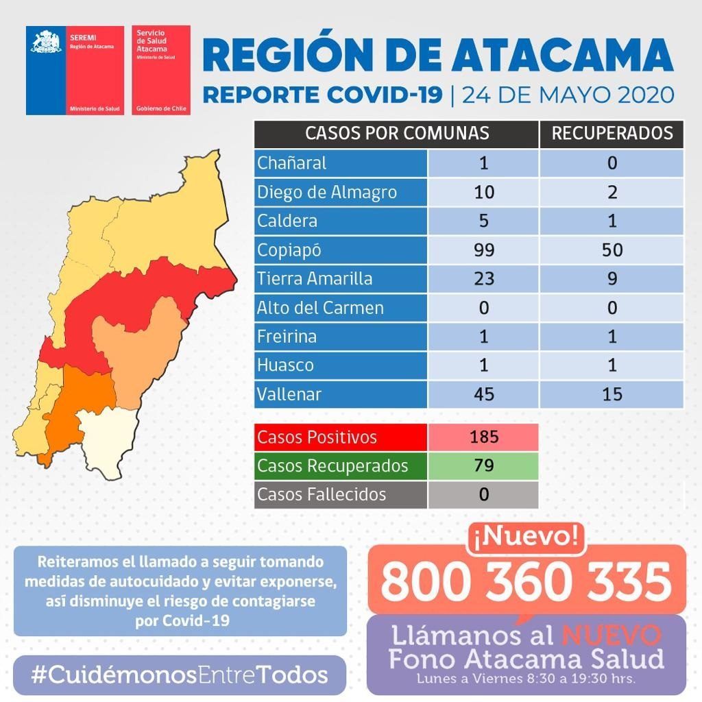 Con ellos, el número de infectados en el territorio regional es de 185, de los cuales 79 han logrado recuperarse; esto deja un total de 106 casos activos, siendo ocho de ellos los que permanecen hospitalizados. Tres están en las Unidades de Cuidados Intensivos (UCI) de Copiapó y Vallenar.