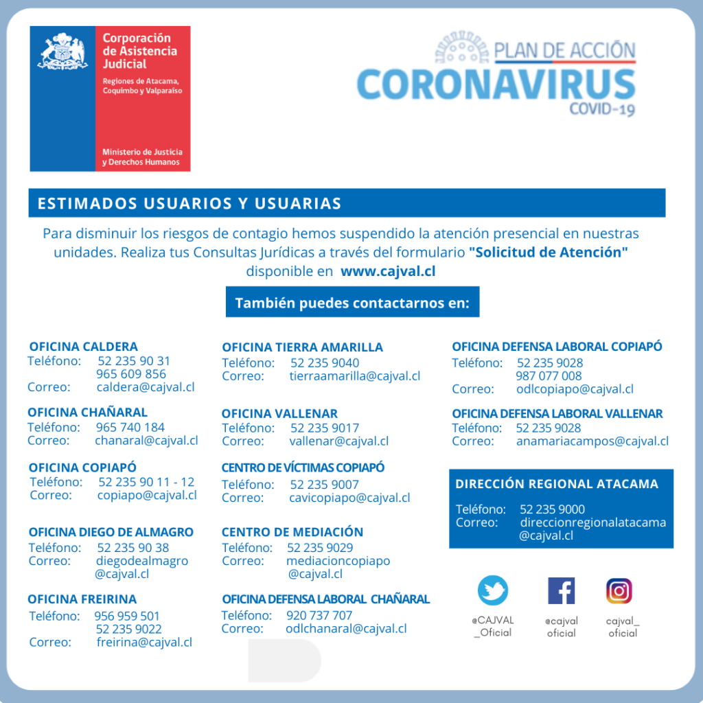 Como una manera de prevenir entre todos la propagación del COVID-19 o Coronavirus, la Corporación de Asistencia Judicial (CAJ), ha suspendido temporalmente la atención presencial en sus unidades, implementando mecanismos alternativos para la atención de los usuarios, medida que se extenderá hasta el 30 de abril, salvo instrucción de la autoridad sanitaria.