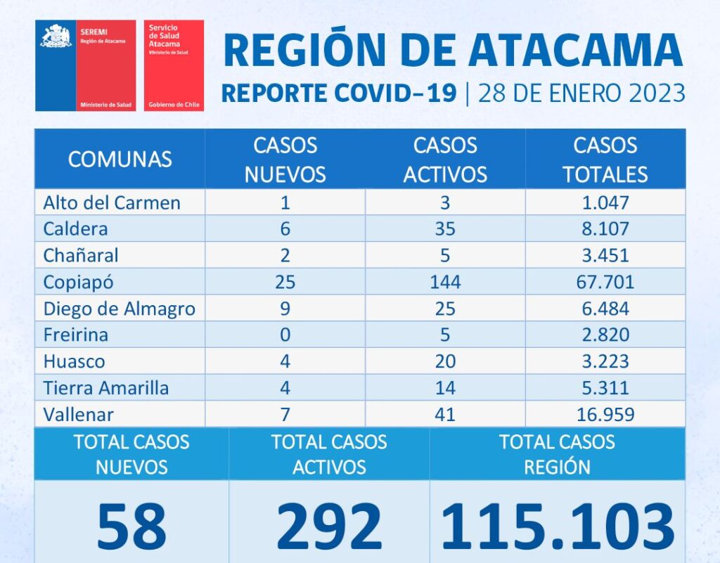 Este sábado 28 de enero, el informe regional de Covid-19 dio a conocer que se reportaron 58 nuevos casos en la región de Atacama. Además, se dio cuenta de 292 casos activos (contagiantes) a nivel regional. Vale decir, que tras validación a nivel central 2 casos se trasladaron a la región.